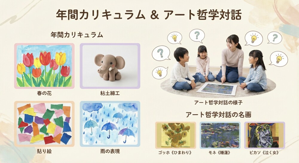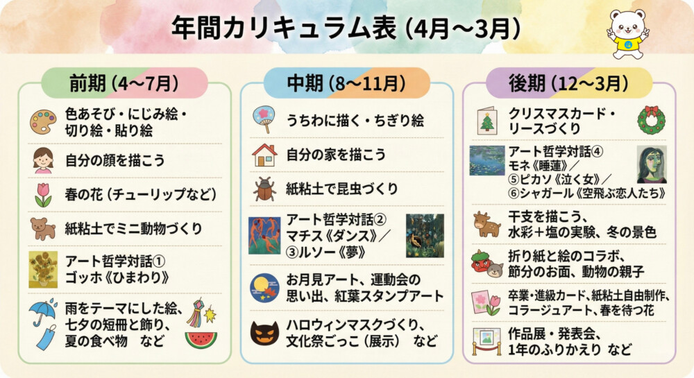 季節に合わせた制作・工作から、色あそび、紙粘土、名画鑑賞まで。