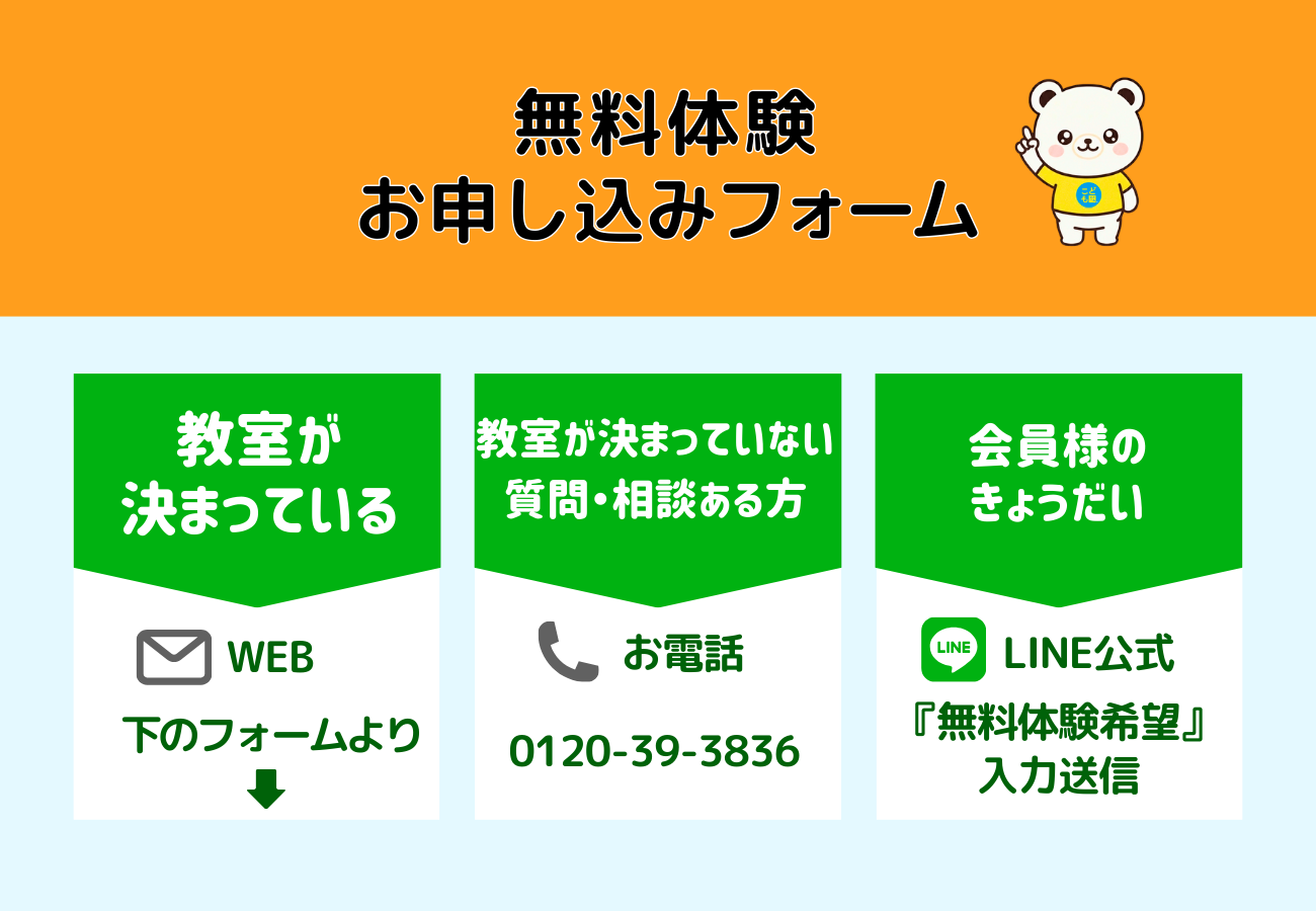 (注1)教室の開講曜日をご確認の上ご記入ください。 (注2)お友達紹介特典は、体験前にお申し出いただいた方に限ります。 (注3)受付後、近日中に入力いただいたメールアドレスへ返信いたします。ご確認をお願いします。 ◎体験時間 17:45〜(20分間) 筆記用具をお持ちください。